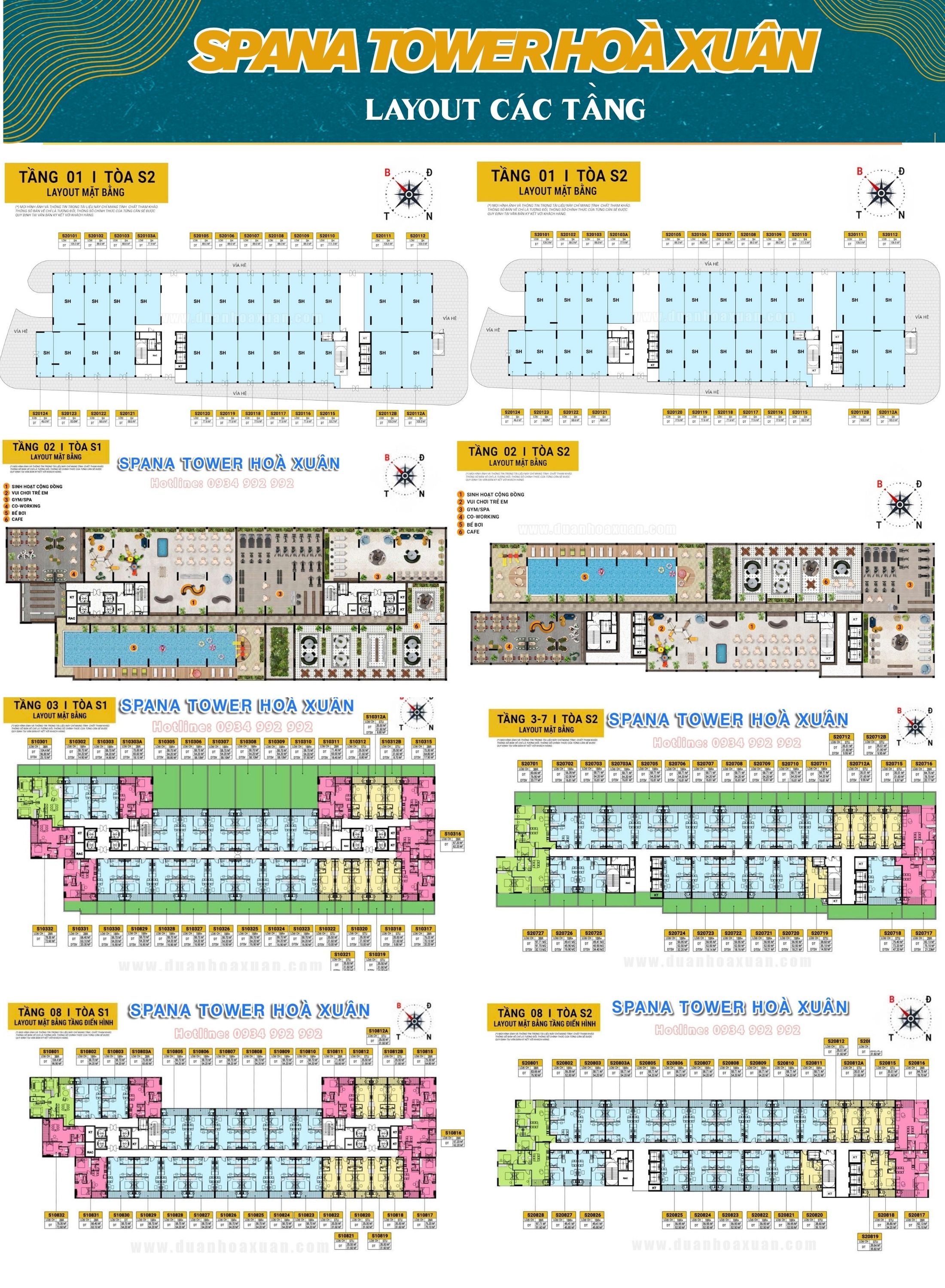 Full Layout đầy đủ từ Tầng Shophousse cho đến các tầng căn hộ tiêu chuẩn Spana Tower Hoà Xuân